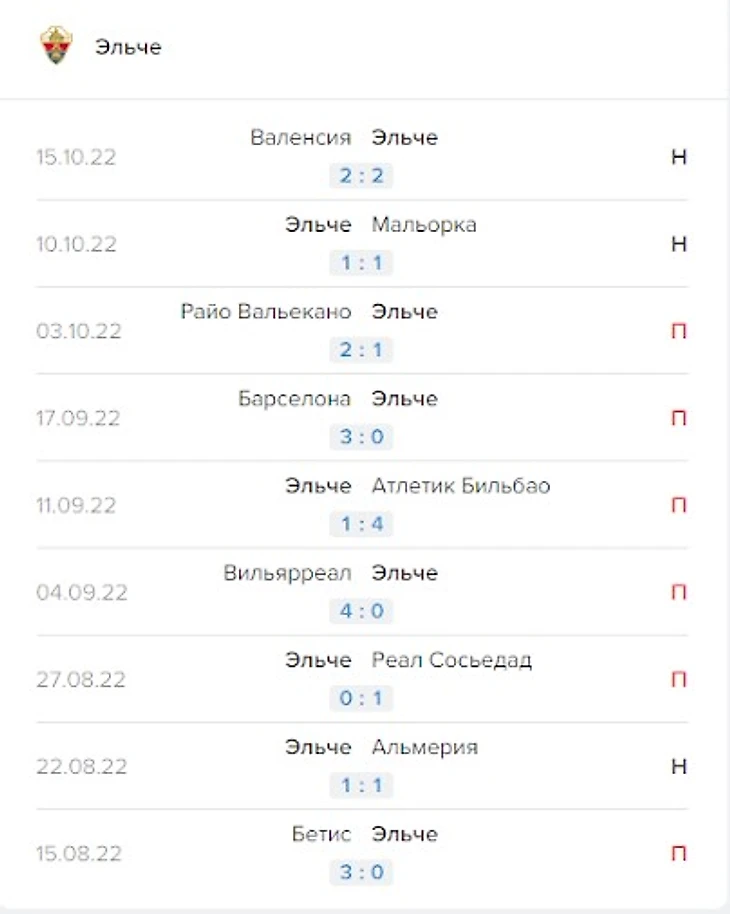 Игра с «Валенсией» стала второй подряд с набранными очками. До этого у команды была серия поражений из 5 встреч. Всего на дистанции в 10-ть официальных игр у «Эльче» 1 победа, 3 ничьи и 6 поражений. Разница голов 9:22. Если брать только домашние встречи, то у клуба 2 победы, 3 ничьи и 5 поражений. Последнее домашняя победа еще в прошлом сезоне. В новом сезоне две ничьи и два поражения. Результаты «Эльче» в матчах Ла Лиги розыгрыша 2022/2023.
