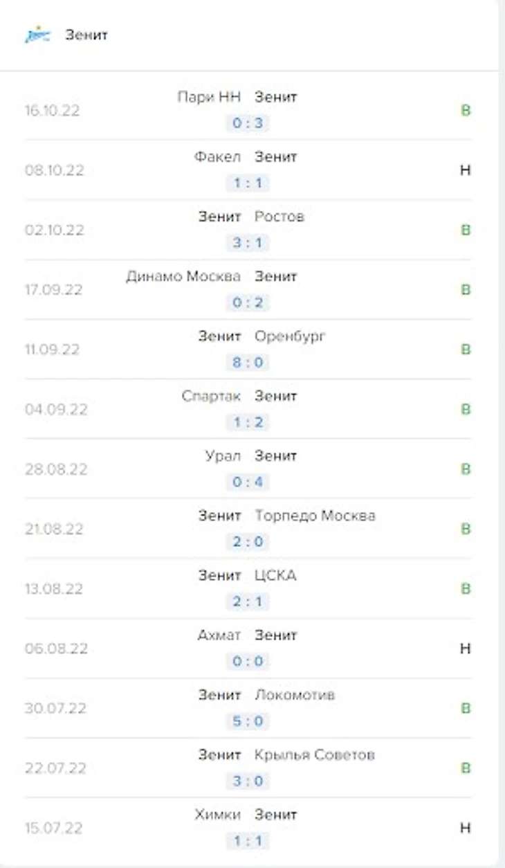 «Зенит» проиграл два матча из последних 10-ти. Оба поражения в гостях и в рамках Кубка России. В остальных встречах 7 побед и 1 ничья. Разница голов 23:9. В 6 играх команды забили три и более гола. «Зенит» пропустил в 6 играх. Забивает «Зенит» в 8 из 10 матчей. Результаты «Зенита» в матчах РПЛ розыгрыша 2022/2023.