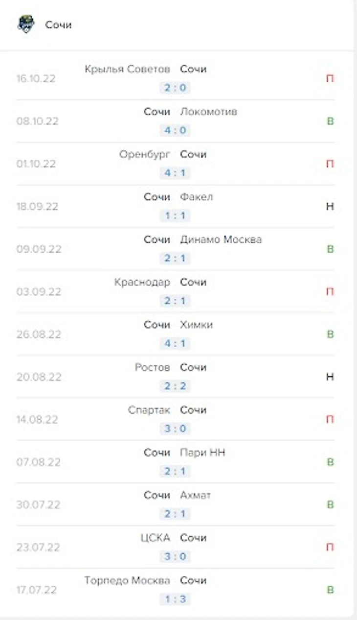 У «Сочи» всего две победы в 10-ти крайних официальных играх. Обе победы домашние и над столичными клубами. Черноморский клуб обыграл «Локомотив» и «Динамо». В остальных встречах одна ничья и семь поражений. Все матчи с набранными очками прошли на стадионе «Фишт» в Сочи. Общая разница голов 13:20. В 7 матча было забито 3 и более гола, в 7 играх прошел обмен голами. В 5 гостевых играх «Сочи» пропускает не менее 2 мячей. Результаты «Сочи» в чемпионате России 2022/2023.