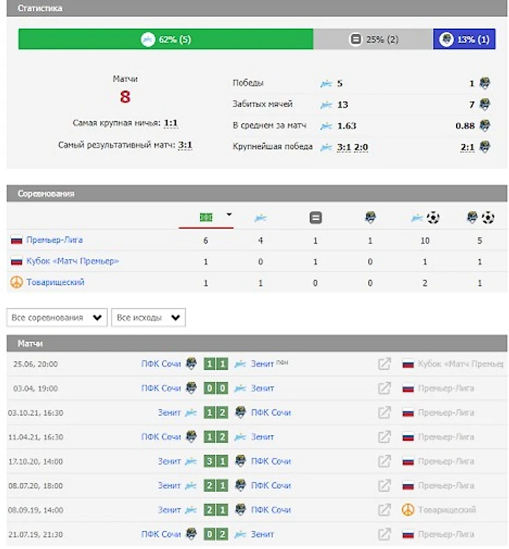 6 из 8 матчей пришлись на игры чемпионата России. «Зенит» выиграл 4 матча, по разу проиграл и сыграл вничью. На домашней арене «Зенит» дважды обыграл «Сочи» и проиграл в прошлом сезоне. Во всех трех играх прошла ставка на ТБ2,5 и обмен голами.