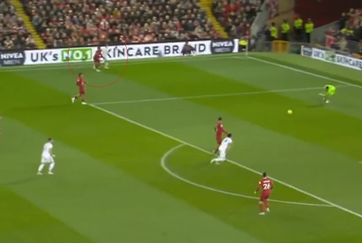 Защитник принял мяч на правом фланге, развернулся и покатил на Алиссона. Но пас оказался неточным, поскольку голкипера не было у вратарской, он побежал по направлению к Гомесу.