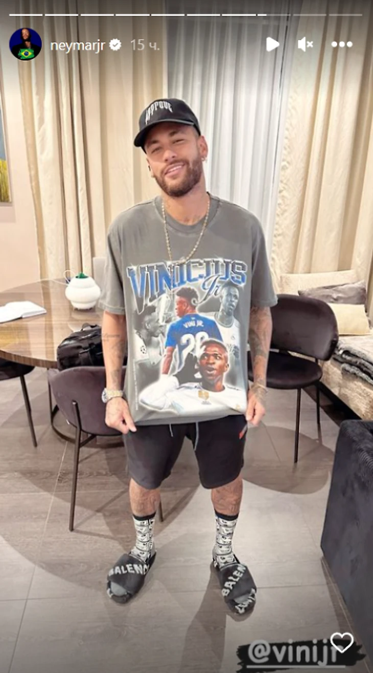 Неймар сделал фото в футболке с изображением нападающего «Реала» Винисиуса.