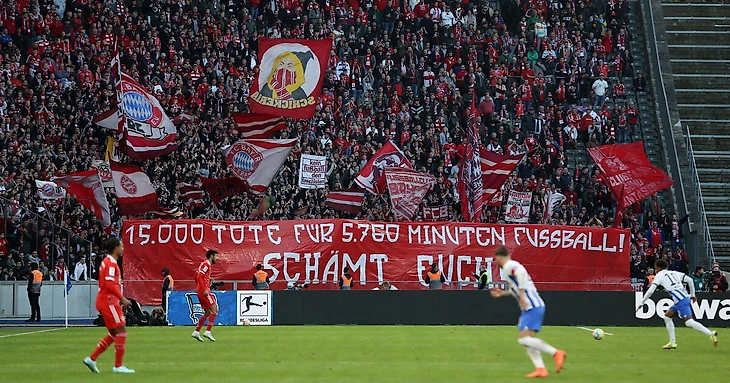 На матче Бундеслиги против «Герты» в Берлине фанаты мюнхенцев вывесили баннер со следующим текстом: «15 тысяч погибших ради 5760 минут футбола! Вам должно быть стыдно».