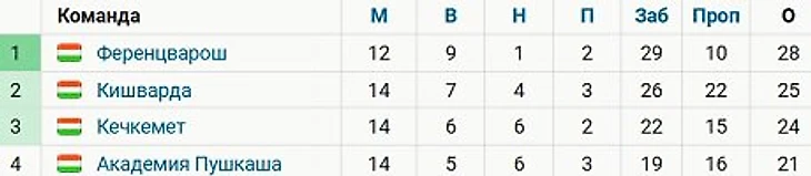 На данный момент «Ференцварош» занимает первое место в турнирной таблице с отрывом в три очка от «Кишварды». При этом команда имеет две игры в запасе.
