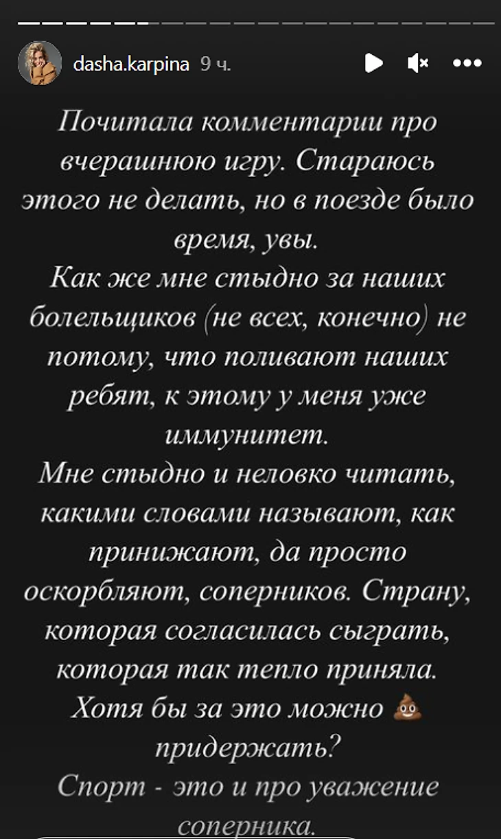 Спорт – это и про уважение соперника», – написала Дарья Карпина в инстаграме.