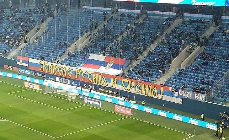 На фанатском секторе хозяев, «Зенита», появилось пожелание на сербском процветания России и Сербии и два триколора стран.
