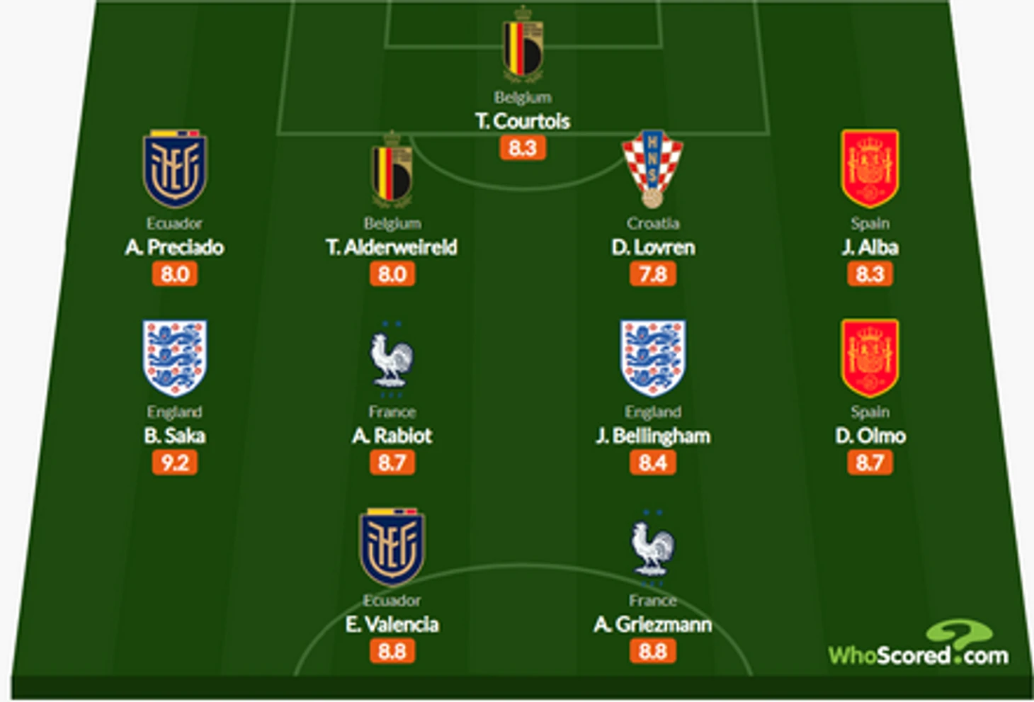 В сборную также вошли вратарь Тибо Куртуа (8,3), защитники Тоби Алдервейрелд (оба – Бельгия, 8,0), Анхело Пресиадо (Эквадор, 8,0), Жорди Альба (8,3), хавбеки Дани Ольмо (оба – Испания, 8,7), Букайо Сака (9,2), Джуд Беллингем (оба – Англия, 8,4), Адриен Рабьо (8,7), форварды Антуан Гризманн (оба – Франция, 8,8), Эннер Валенсия (Эквадор, 8,8).