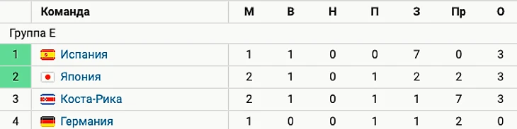 Коста-Рика сегодня обыграла Японию (1:0). Японцы же в 1-м туре победили Германию (2:1). Теперь у Японии и Коста-Рики по 3 очка. Испания в 1-м туре разгромила Коста-Рику (7:0) и на данный момент лидирует в группе.