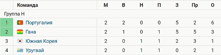 Португалия возглавляет группу H с 6 очками. У Ганы – 3, у Южной Кореи и Уругвая – по 1