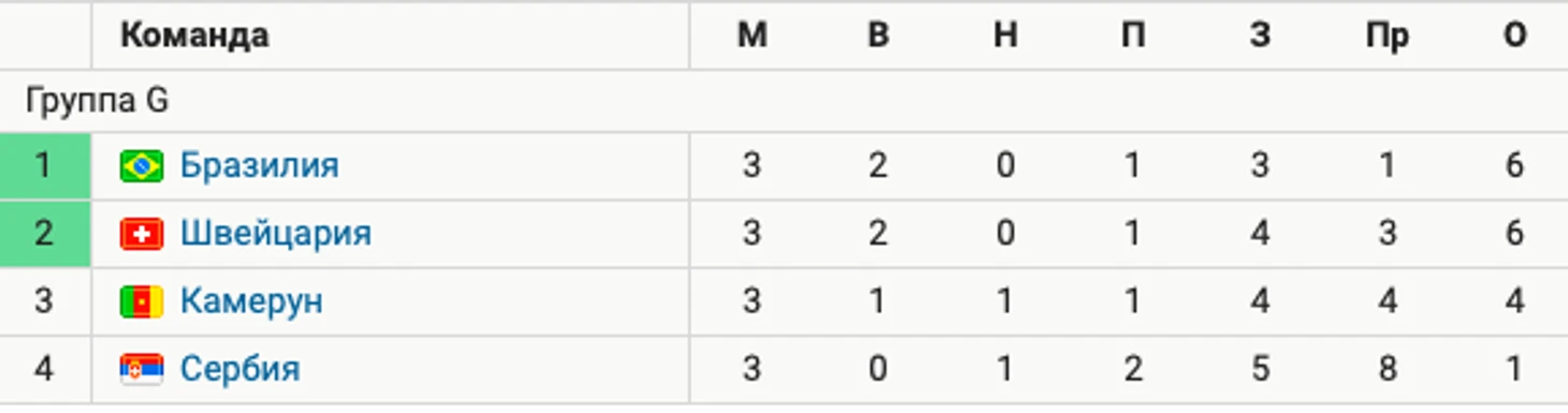 Сербия заняла 4-е место, став самой результативной в группе G – 5 голов. Бразилия забила меньше всех (3) и стала первой
