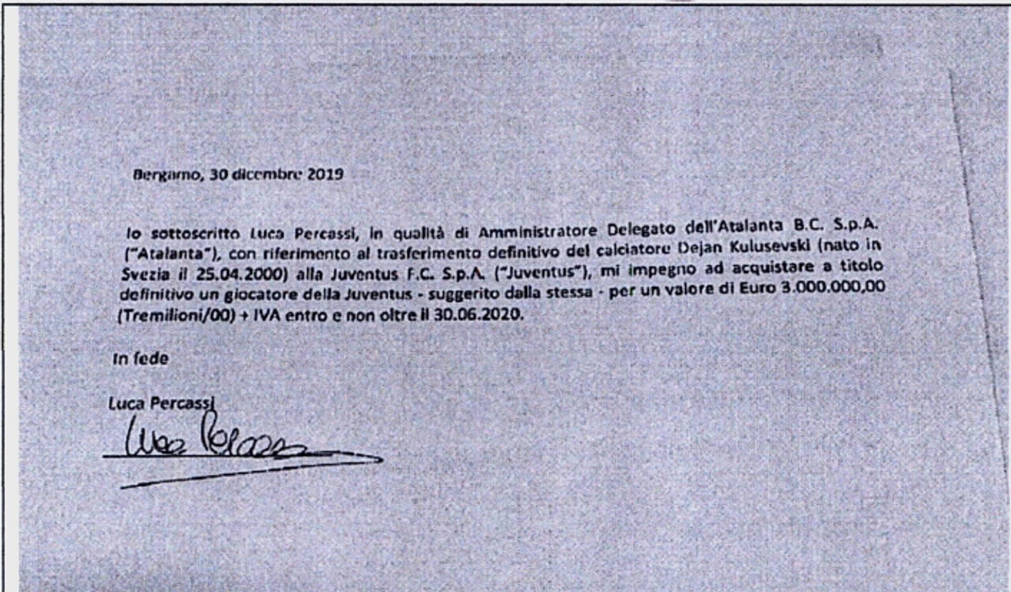 Редактор газеты Il Domani Стефано Фельти опубликовал копию соглашения, подписанного гендиректором «Аталанты» Лукой Перкасси 30 декабря 2019 года.
