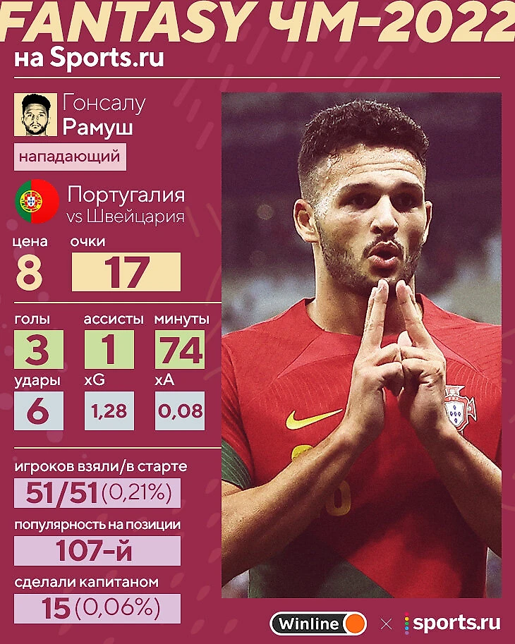 Такой результат принес 17 очков в fantasy-турнире по чемпионату мира-2022 игрокам, взявшим Рамуша в свои команды: по четыре балла за каждый гол, три – за результативный пас, два – за 60 минут на поле.