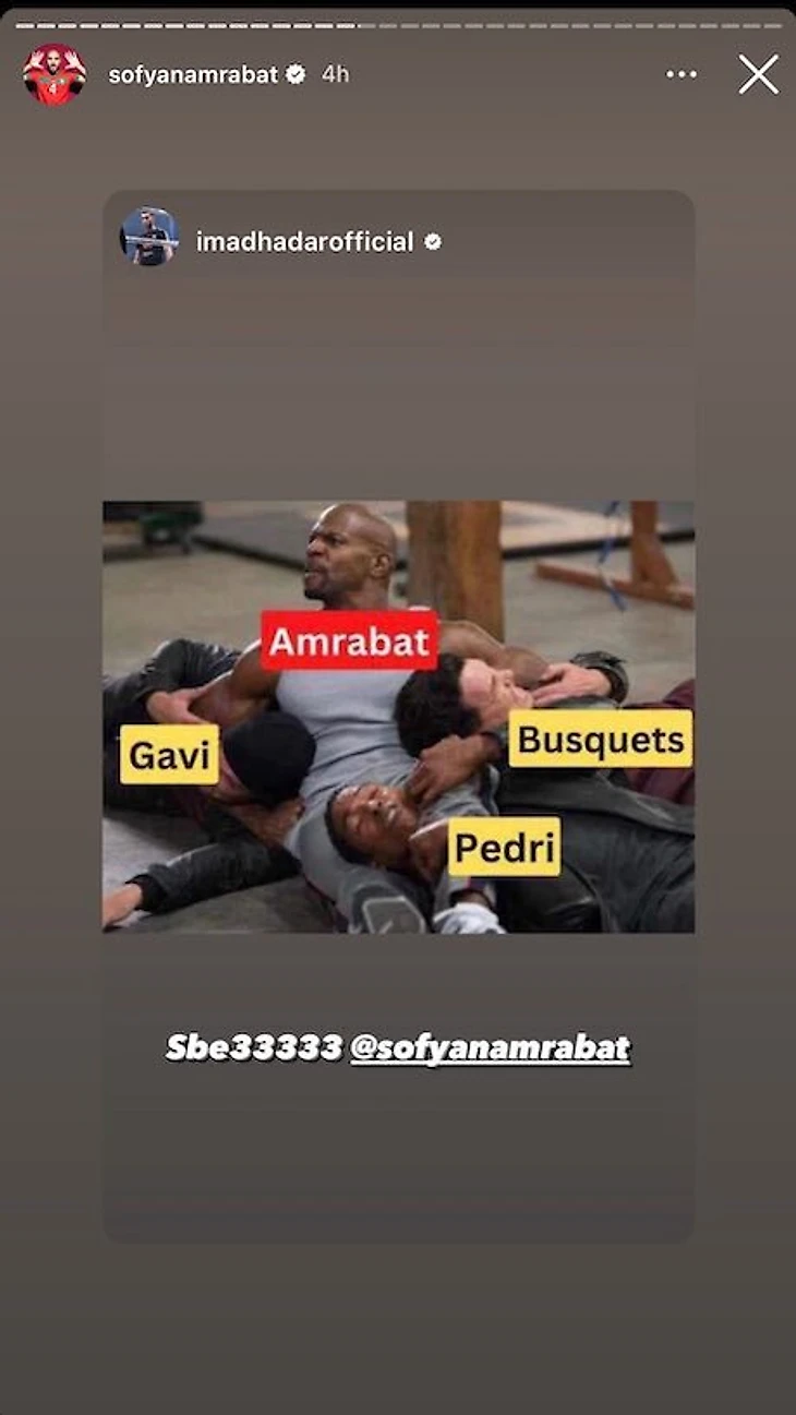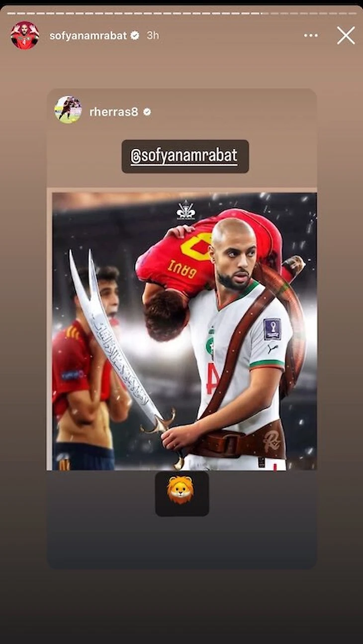 Полузащитник «Фиорентины» и сборной Марокко после победы над Испанией (0:0, по пен. 3:0) в матче 1/8 финала ЧМ-2022 репостнул несколько мемов, сделанных другими пользователями инстаграма.