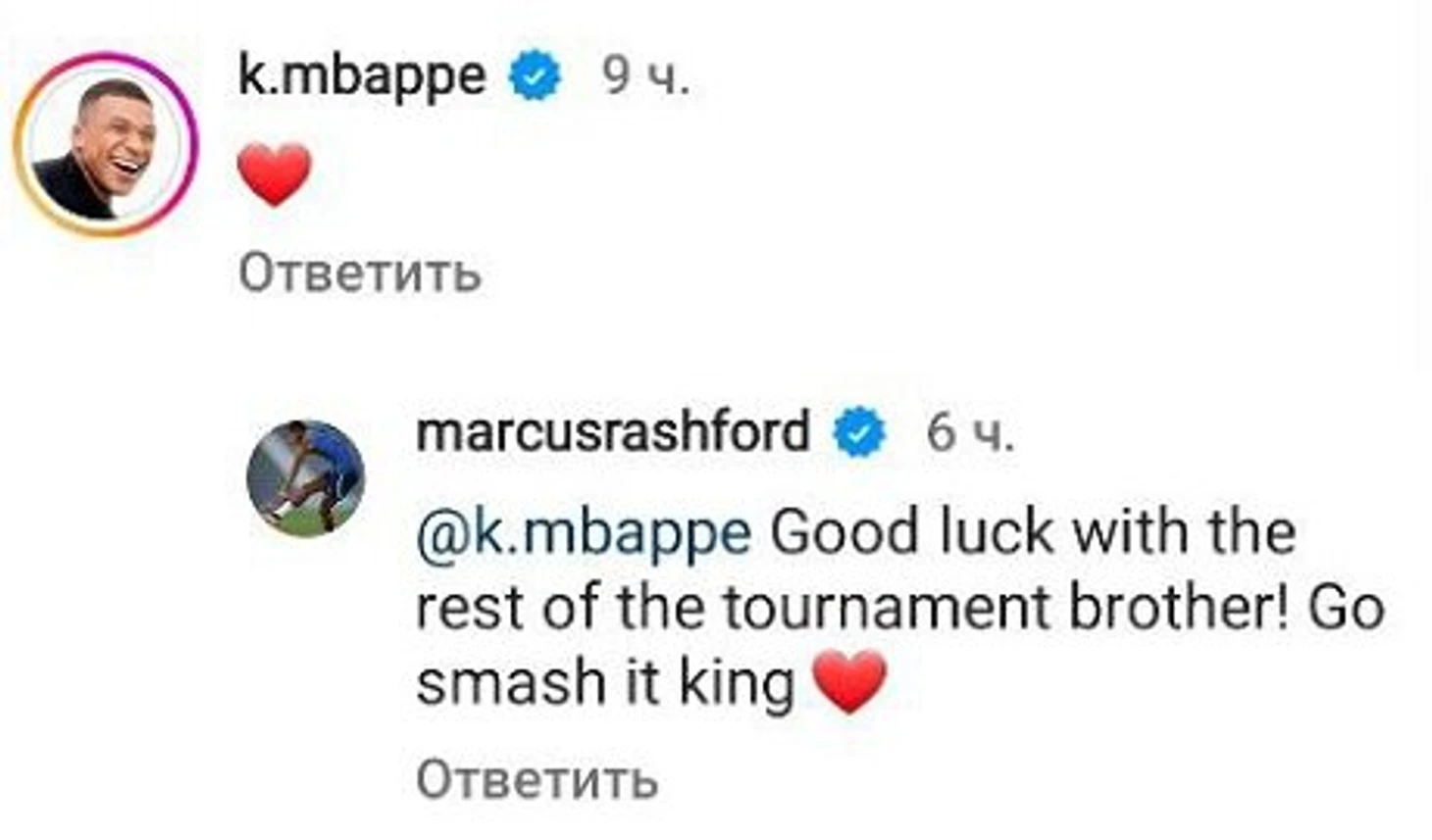 «Удачи в оставшейся части турнира, брат. Разнеси всех, король», – ответил игрок «Манчестер Юнайтед» футболисту «ПСЖ».
