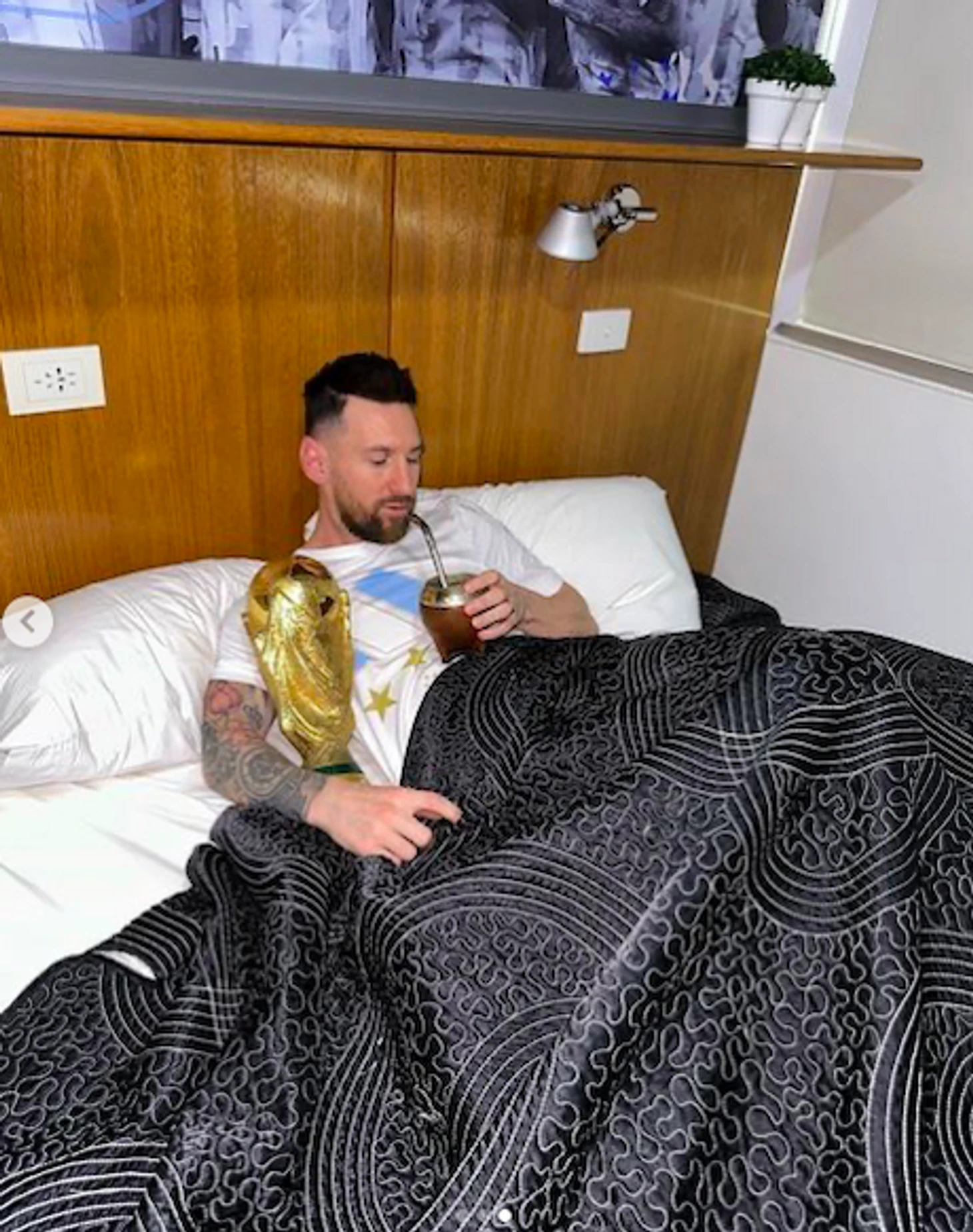 Капитан сборной Аргентины не только опубликовал фотографию, на которой он изображен с Кубком мира в кровати, но и показал, как пил мате, сидя в кровати, рядом с Кубком мира.