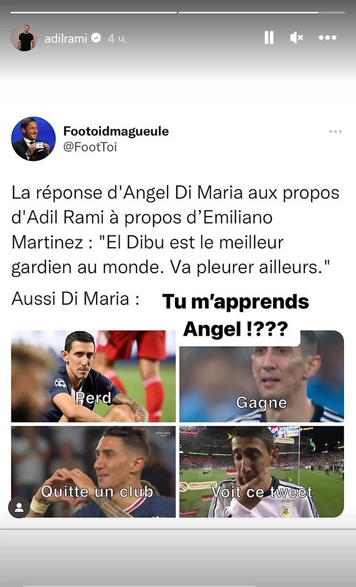 Экс-защитник сборной Франции Адиль Рами продолжил конфронтацию с Анхелем Ди Марией.
