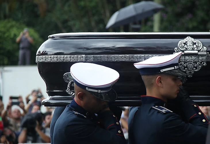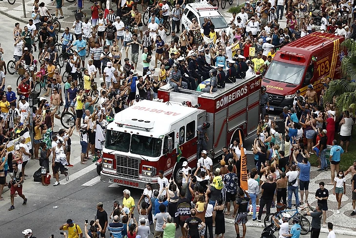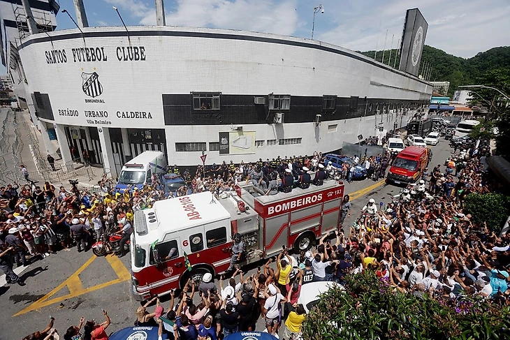 После этого черный гроб с телом Пеле, обернутый в бразильский флаг, солдаты почетного караула пронесли по улице до дома 100-летней матери экс-игрока Селесты. Затем гроб провезли по улицам Сантоса на пожарной машине.
