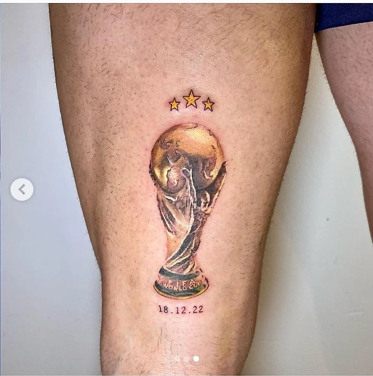 Полузащитник сборной Аргентины и «Севильи» сделал три тату, изобразив у себя на теле свою футболку, сэйв Эмилиано Мартинеса на 123-й минуте финального матча против Франции и Кубок мира с тремя звездами в честь трех побед Аргентины на турнире.