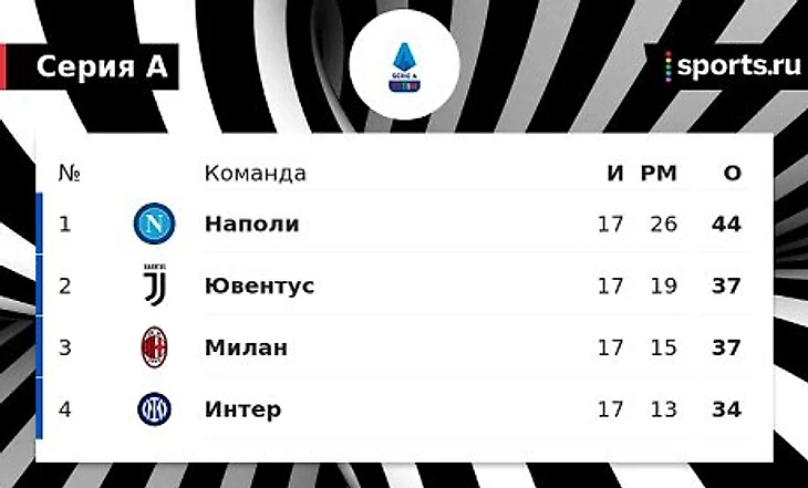 «Наполи» на 7 очков опережает «Милан» и «Ювентус» и на 10 – «Интер», лидируя в Серии А
