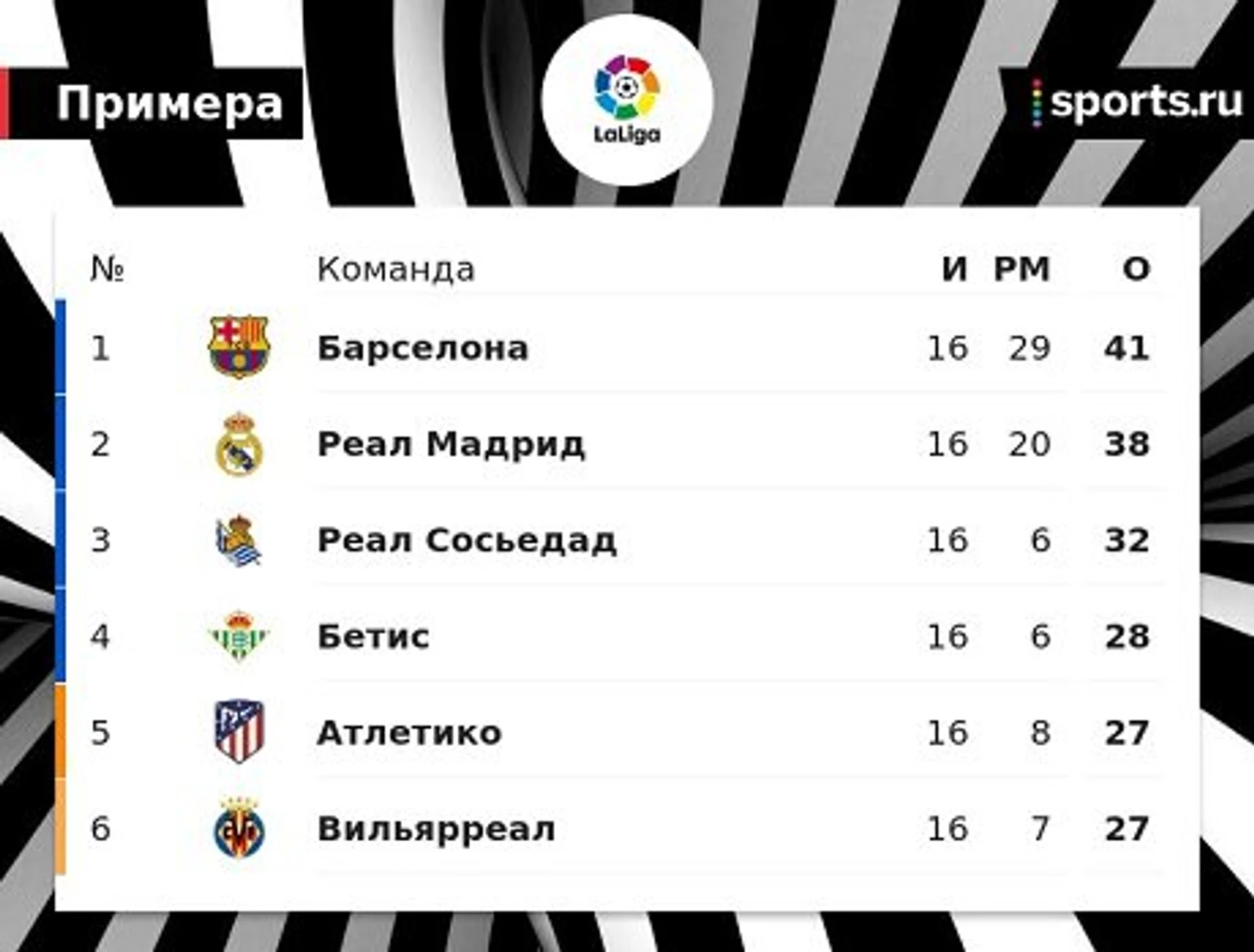 На третьей позиции в таблице идет «Реал Сосьедад» с 32 очками, четвертое место занимает «Бетис», набравший 28. «Атлетико» и «Вильярреал» имеют по 27 баллов.