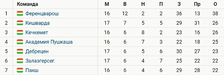 «Кишварда», идущая второй, набрала 26 баллов, проведя на игру больше. Столько же очков у «Кечкемета» за 16 игр.