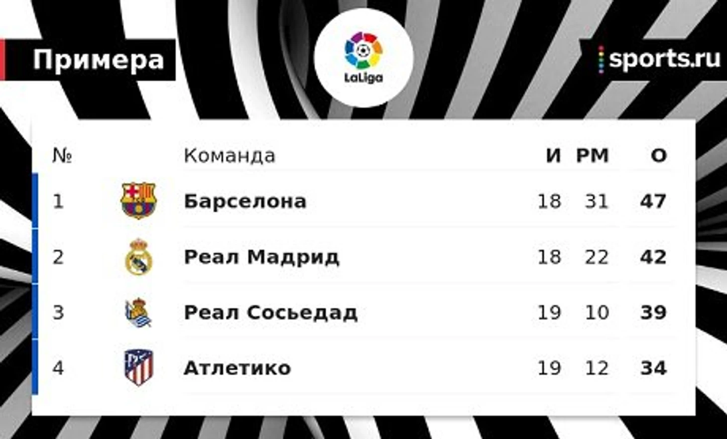 Теперь команда тренера Хави опережает команду Карло Анчелотти на 5 очков – 47 против 42. «Сосьедад» идет 3-м (39), «Атлетико» замыкает четверку (34).
