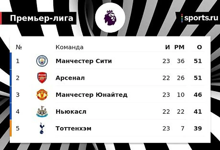 У команд Пепа Гвардиолы и Микеля Артеты теперь по 51 очку, но «Сити» выше благодаря лучшей разнице забитых и пропущенных голов: «+36» против «+26».