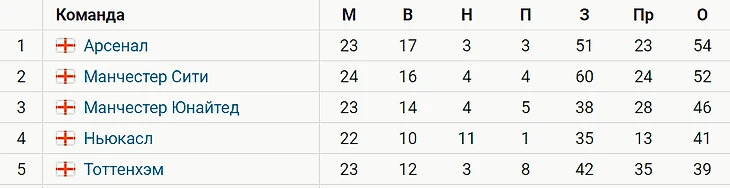 «Арсенал» опережает «Ман Сити» на 2 очка при игре в запасе после 24-го тура АПЛ