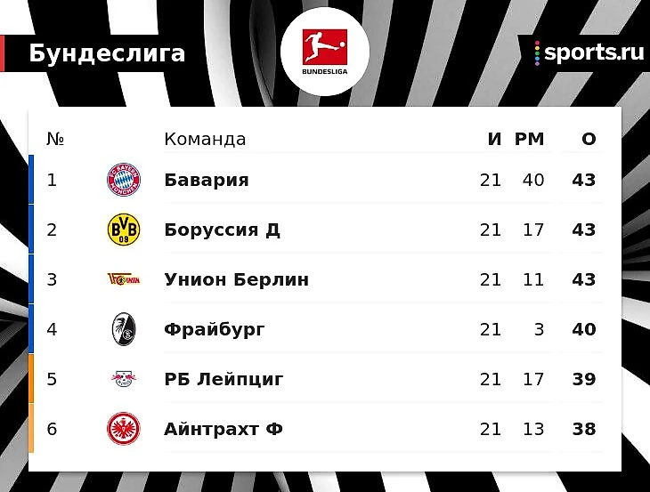 «Бавария», «Боруссия» Дортмунд и «Унион» набрали по 43 очка в Бундеслиге. Мюнхенцы на 1-м месте