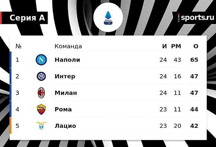 Четвертой идет «Рома» – у команды Жозе Моуринью 44 очка и матч в запасе. «Лацио» с 42 очками и игрой в запасе – 5-й.