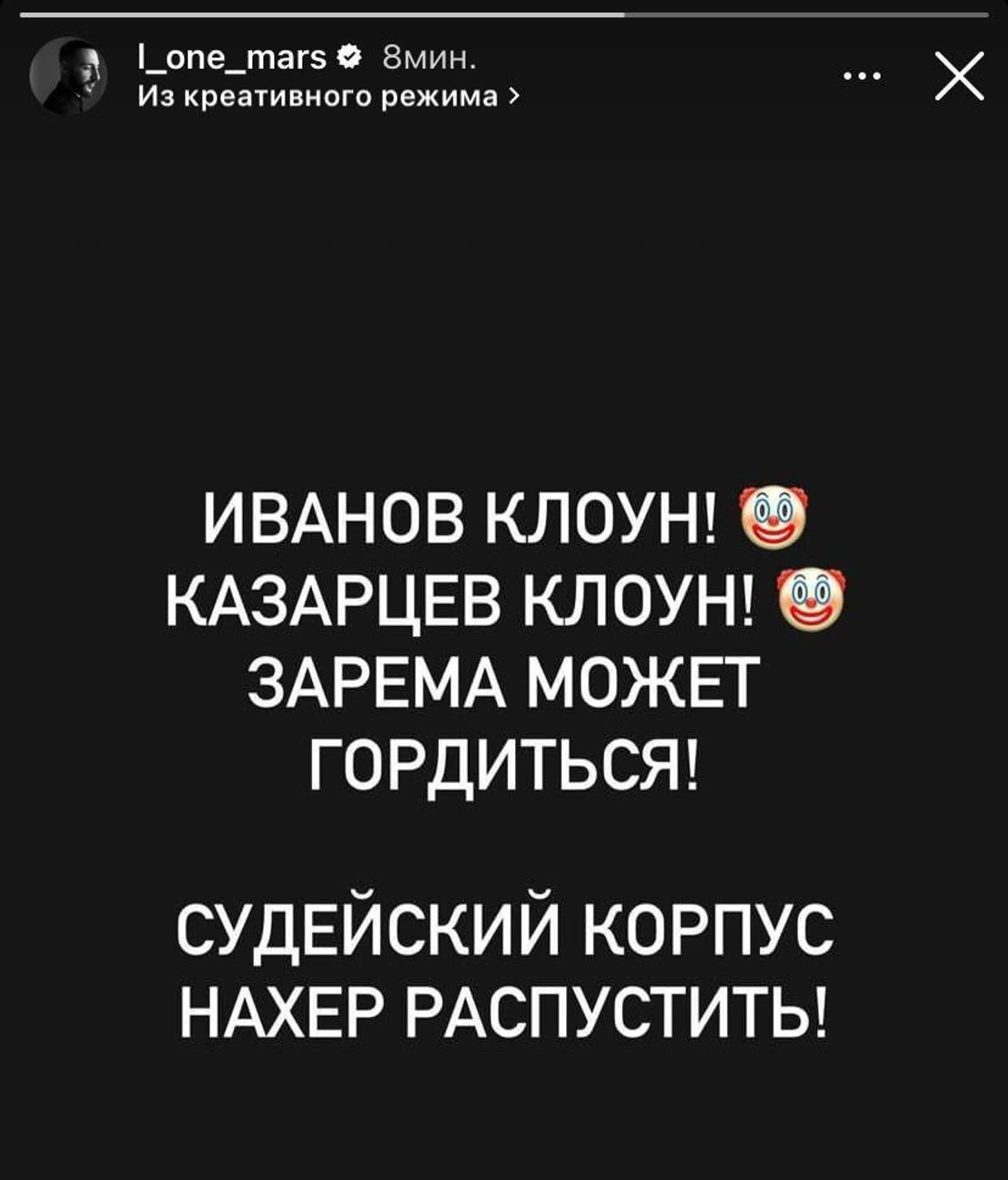 «Иванов и Казарцев – клоуны. Зарема может гордиться. Судейский корпус на хер распустить!» Рэпер L’One о матче «Спартак» – «Локомотив»