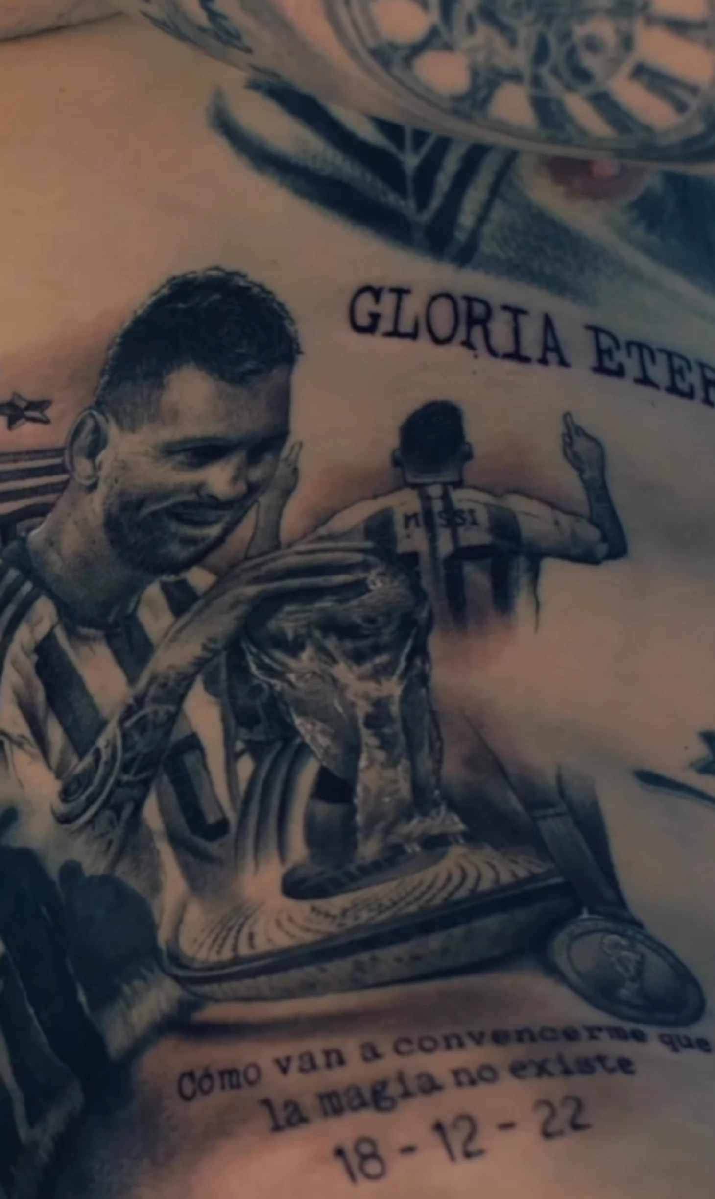 Защитник сборной Аргентины и «Бенфики» показал тату на правой стороне живота, где изображен игрок «ПСЖ», касающийся Кубка мира, а также стоящий спиной и воздевающий руки к небу.