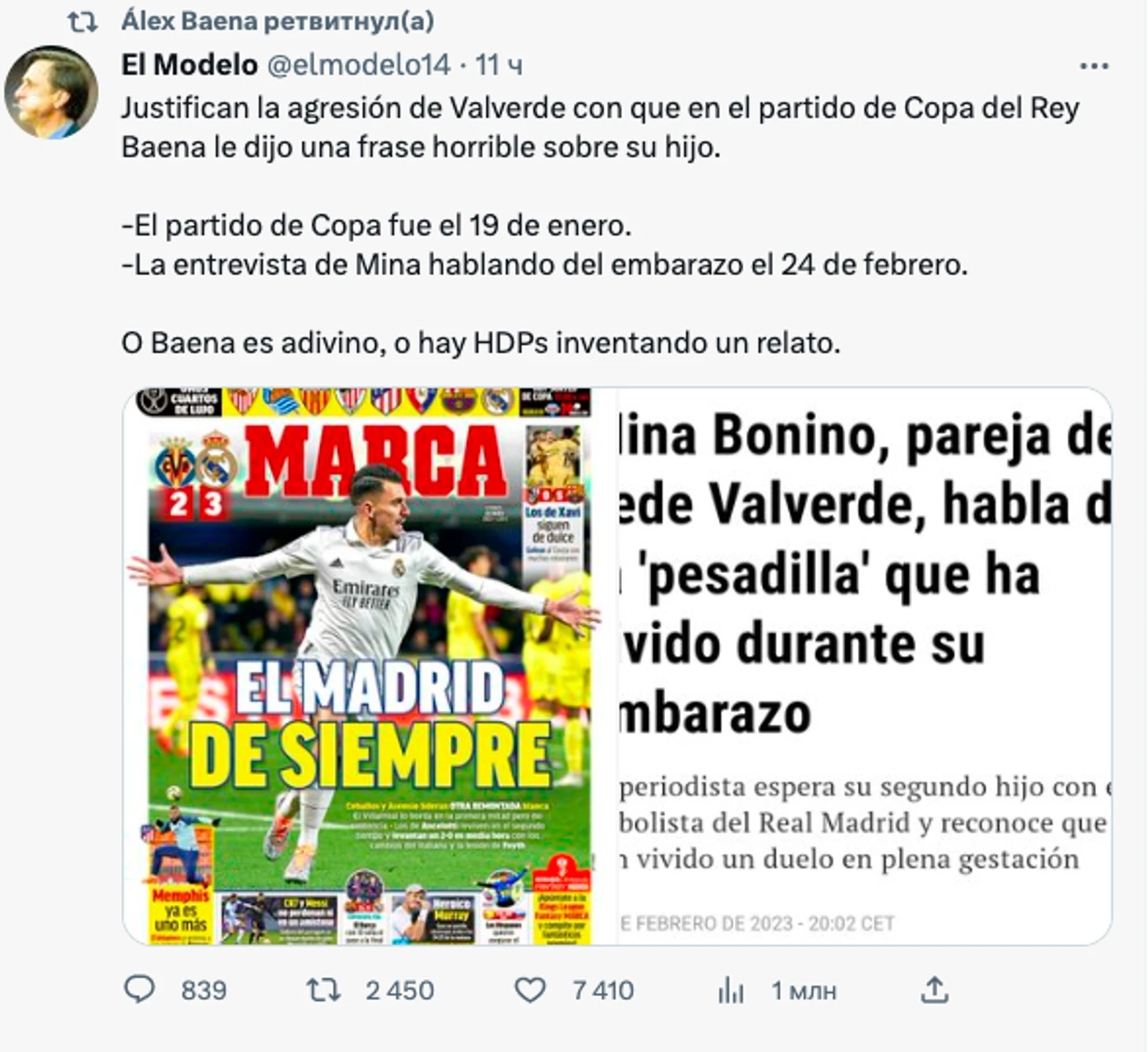 Баэна репостнул твит, где Вальверде попытались уличить во лжи. В нем сказано, что интервью о беременности жена Феде дала после игры Кубка, хотя она сообщила о проблемах за 3 дня до нее