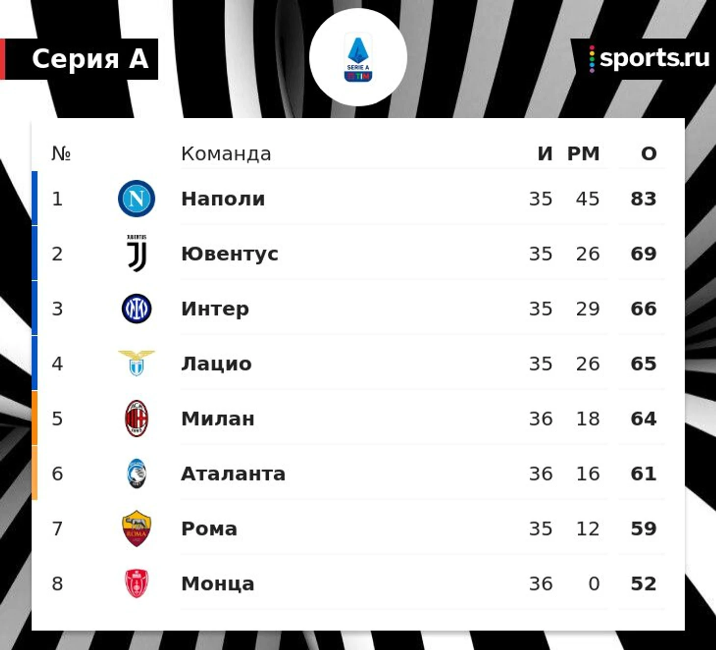 После 35 проведенных туров Серии «бьянконери» занимают 2-е место в турнирной таблице, набрав 69 очков.