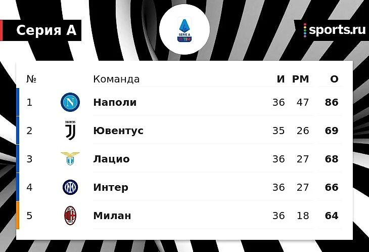 Теперь «Лацио» идет 3-м, набрав 68 очков. У «Интера» 66 баллов. Вторым идет «Ювентус» с 69 очками и игрой в запасе.