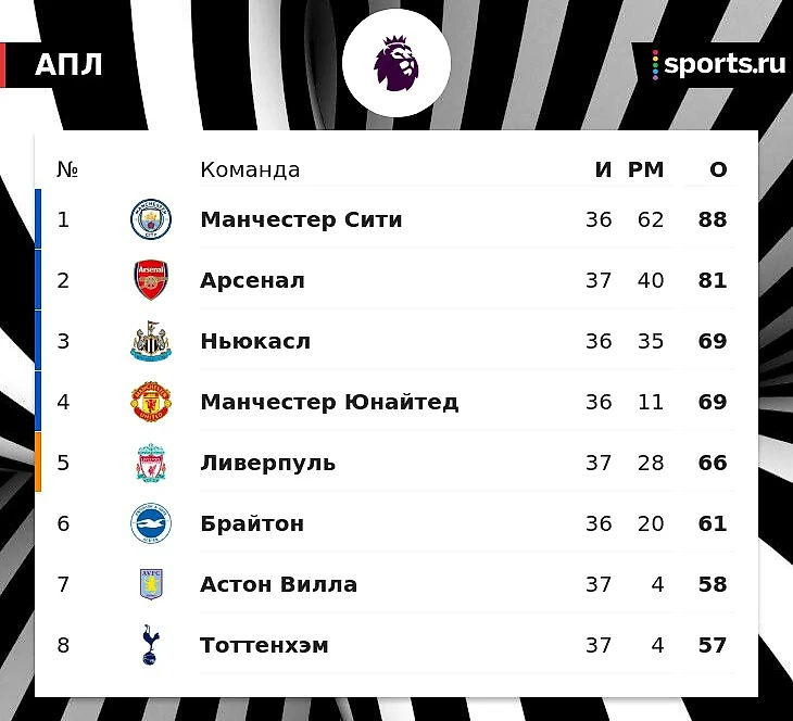Она занимает 6-е место с 61 баллом после 36 игр. На 7-й строчке идет «Астон Вилла» (58 очков после 37 матчей), на 8-й – «Тоттенхэм» (57 баллов после 37 игр). Также «Брайтон» еще сохраняет шансы подняться на пятое место – там «Ливерпуль» с 66 очками после 37 матчей.