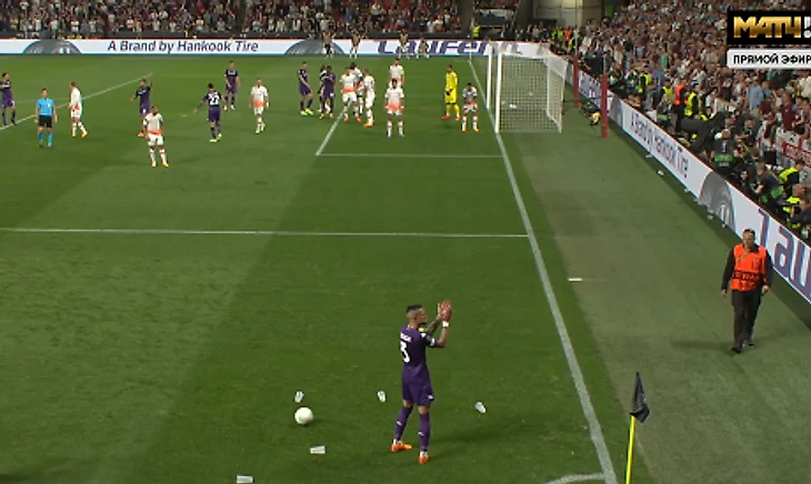 Защитника «Фиорентины» забросали пластиковыми стаканами во время финала Лиги конференций.
