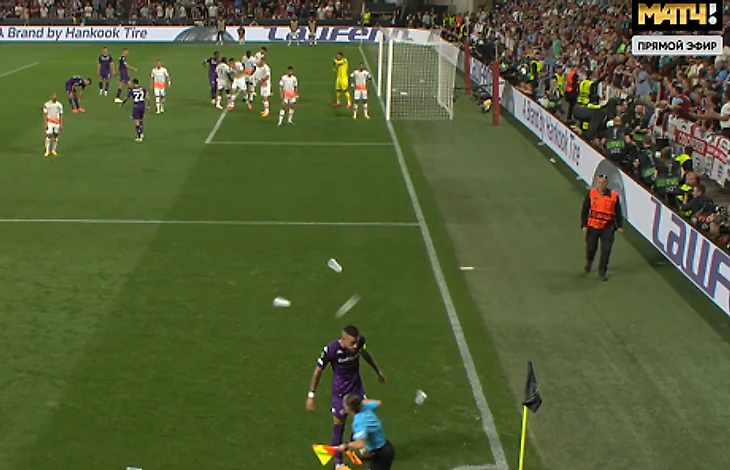 В одном из эпизодов матча защитник флорентийцев Кристиано Бираги пошел подавать угловой. Фанаты английского клуба стали бросать в футболиста пластиковые стаканы.