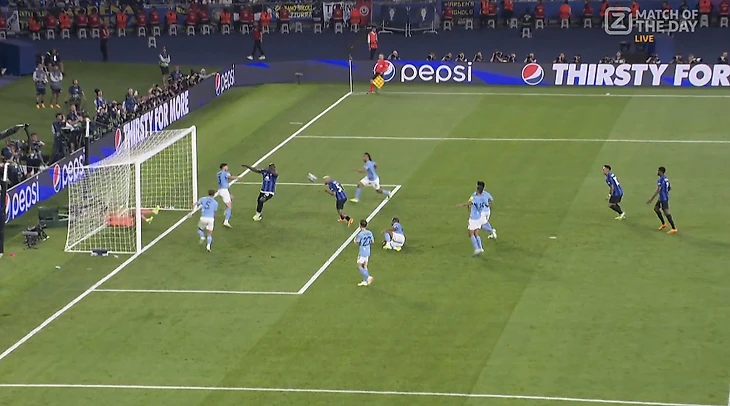 Защитник «Интера» Федерико Димарко на 71-й минуте оказался прямо перед створом ворот «Манчестер Сити» и пробил головой так, чтобы перебросить вратаря Эдерсона. Мяч попал в перекладину. Димарко сразу же добавил, снова пробив головой в падении.