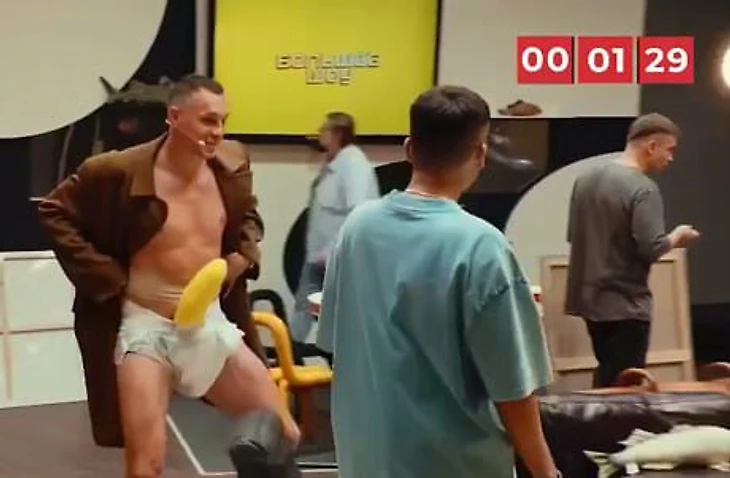 Дзюба появился в программе в плаще на голое тело и с торчащим из трусов игрушечным бананом.