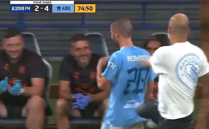 Гвардиола в шутку пнул Бернарду под зад после замены в матче с «Йокогама Ф. Маринос». Португалец провел на поле 30 минут