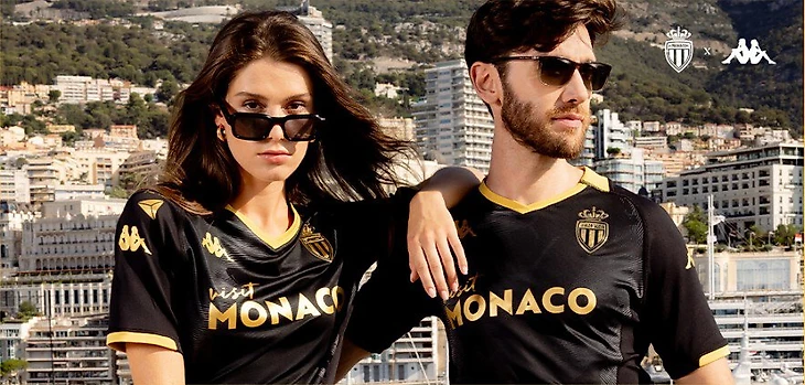 Позолоченная эмблема и шрифты олицетворяют наследие клуба. Кроме того, на переднюю часть футболки нанесены контуры княжества Монако.