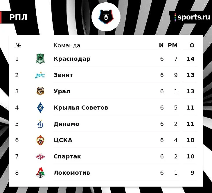 «Спартак» на 4 очка отстает от «Краснодара» после 6 туров, от «Зенита» и «Урала» – на 3