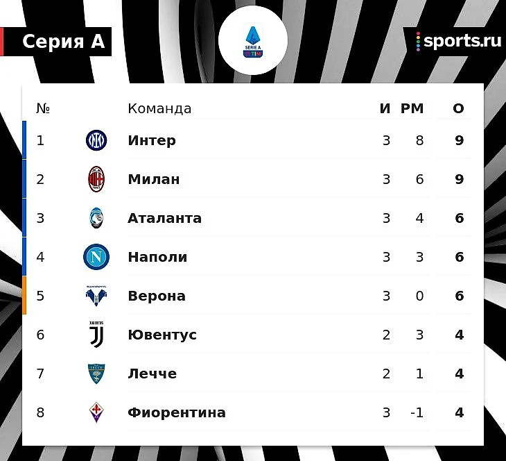 «Интер» лидирует в чемпионате с 9 очками. Столько же набрал только «Милан». Миланское дерби состоится в следующем туре – 16 сентября.