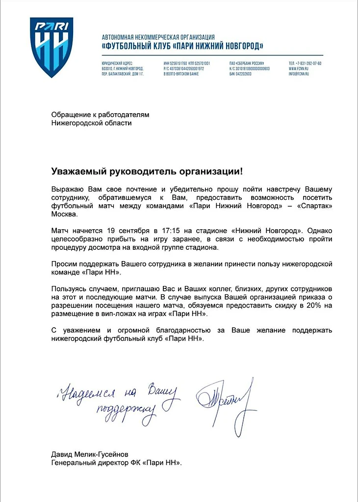 Обращение «Краснодара» подписано главным тренером команды Владимиром Ивичем и капитаном Матвеем Сафоновым, ЦСКА предлагает прислать на почту всем желающим документ с подписями тренера Владимира Федотова и капитана Игоря Акинфеева. Обращение «Пари НН» подписал генеральный директор клуба Давид Мелик-Гусейнов.