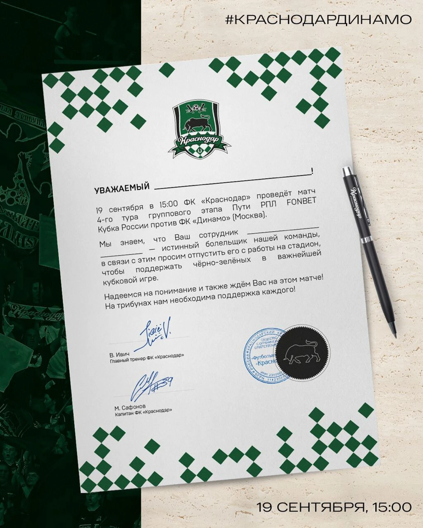 ЦСКА, «Краснодар» и «Пари НН» подготовили обращения для болельщиков, чтобы те могли отпроситься с работы на матчи Кубка России, которые пройдут днем в будни.