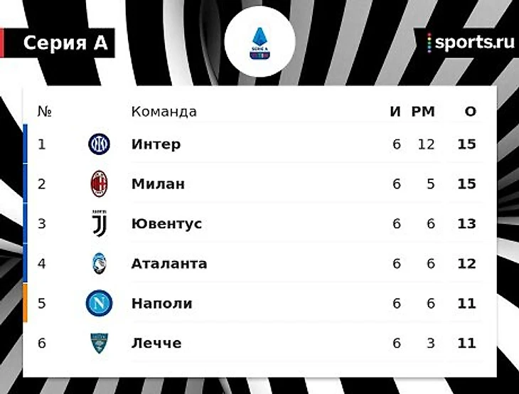После 6 матчей «Интер» и «Милан» лидируют в таблице, набрав по 15 очков. При этом «нерадзурри» опережают «Милан» по разнице забитых и пропущенных мячей.