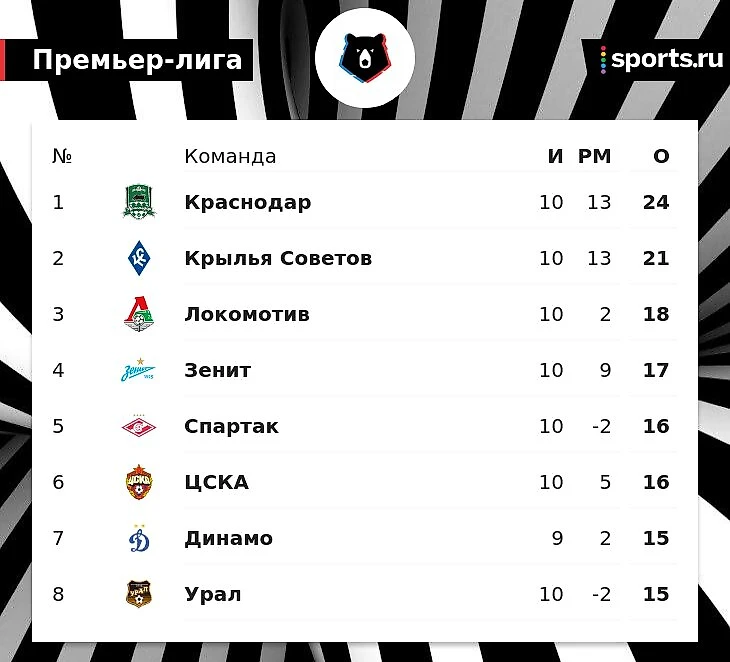 «Спартак» на 8 очков отстает от «Краснодара» после 10 туров, от «Крыльев» – на 5, от «Зенита» – на 1