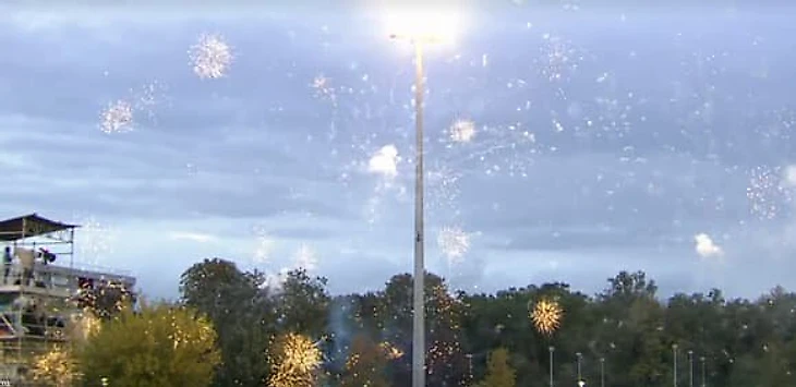 Порядка 10 фейерверков начали взрываться прямо над полем. Футболистки и судьи убежали в раздевалки.