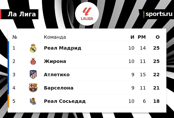 «Жирона» догнала лидирующий «Реал» – у них по 25 очков. У «Атлетико» 22 при матче в запасе